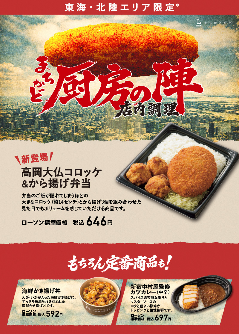インパクト満点の高岡大仏コロッケ&から揚げ弁当。今だけの数量限定ご当地メニュー。