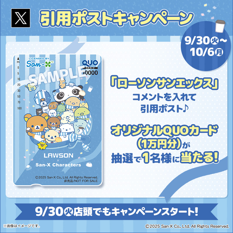 期間中にローソン公式Xアカウント「ローソン(@akiko_lawson)」をフォローし、対象のキャンペーン告知ポストに「ローソンサンエックス」とコメントをつけて引用ポストしていただくと、抽選で1名様に「オリジナルQUOカード1万円分」をプレゼントします!