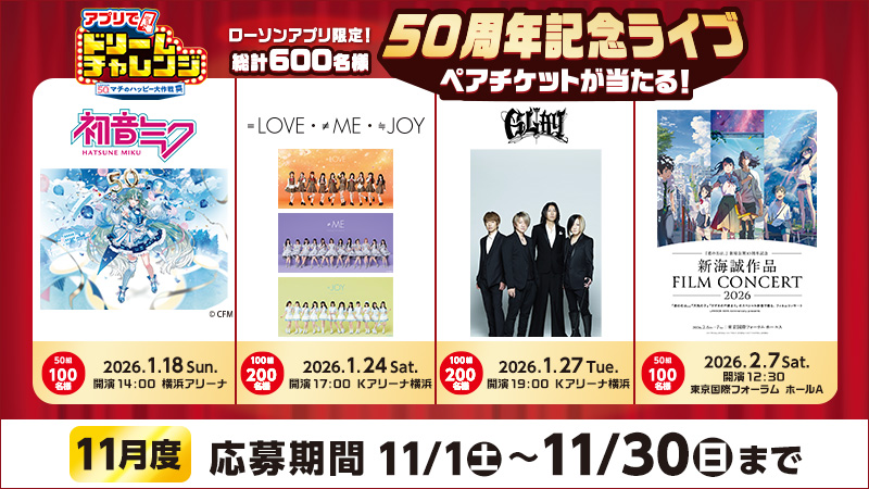 ローソンアプリ限定!合計600名様に、ローソン50周年記念ライブペアチケットが当たります!