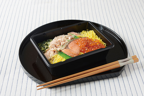いくら醤油漬と紅鮭、焼鮭ほぐしを組み合わせた弁当です。錦糸卵と野沢菜漬を加えることで彩り豊かに仕上げました。
