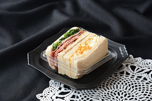 甘めのステーキソースをあわせたローストビーフ・炒めた玉ねぎ・レタスを挟んだ層と、トリュフの香るゴロゴロとした具材感が特長のたまごサラダを挟んだ層を組み合わせました。