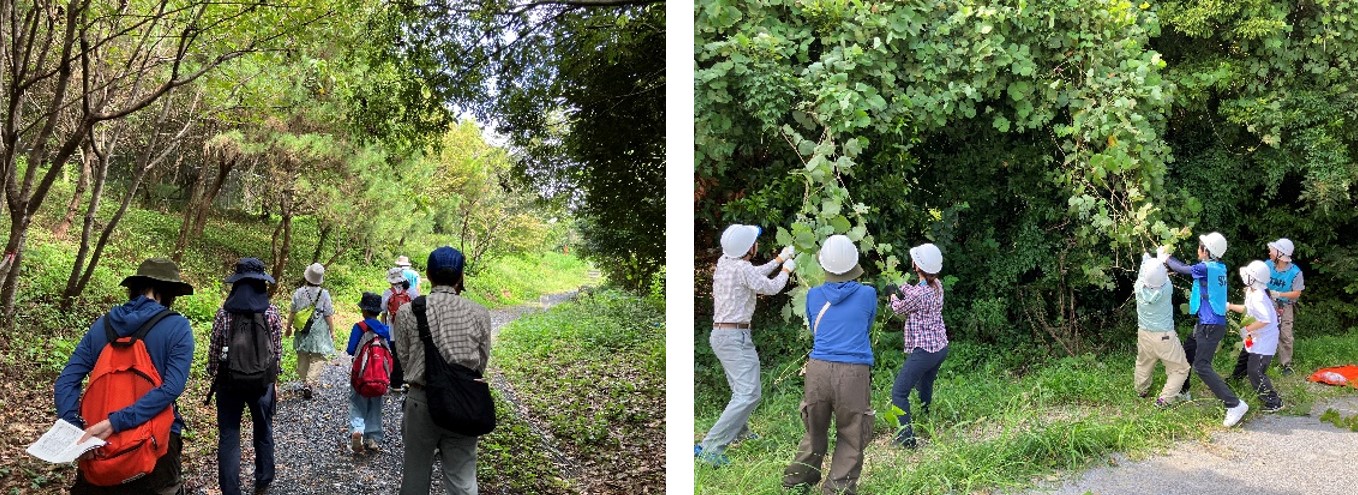 対象はひとり親家庭の母子で、当社ボランティアのメンバーも含めて計13名で活動しました。参加者は、さまざまな植物や昆虫を観察したほか、森林整備としてくずの除草体験や間伐材を使ったコースターづくりなど、森林の大切さや森の生き物について学びながら自然と触れ合う体験をしました。