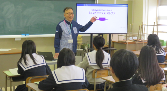 第1回目となる当日は、同校2年生の一部46名に対し、当社社員がコンビニエンスストアのシステム全般や、店舗での1日の仕事の流れ、ローソン本部が行っている仕事について説明しました。