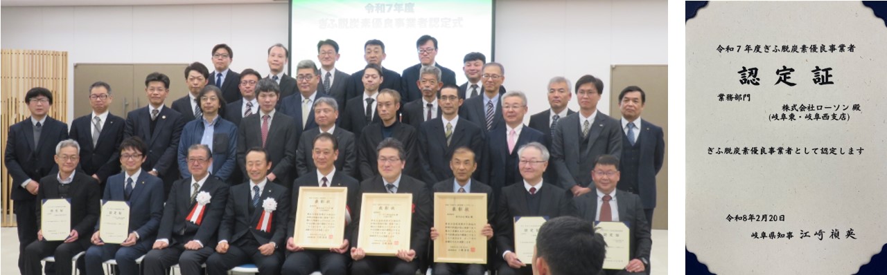 株式会社ローソンの岐阜東支店、岐阜西支店は、令和7年度の「岐阜県地球温暖化防止及び気候変動適応基本条例」に基づく取り組みにおいて、「ぎふ脱炭素優良事業者」に認定されました。2026年2月20日(金)に岐阜県庁で開催された認定式・表彰式で、認定証を授与いただきました。