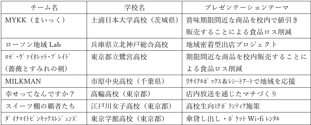 2025年度は、土浦日本大学高校、兵庫県立北神戸総合高校、東京都立鷺宮高校、市原中央高校、高輪高校、江戸川女子高校、東京学館高校など、57校の373チーム1,802名がローソンのインターンとして、当社からの課題(指令)に対して取り組みを行いました。