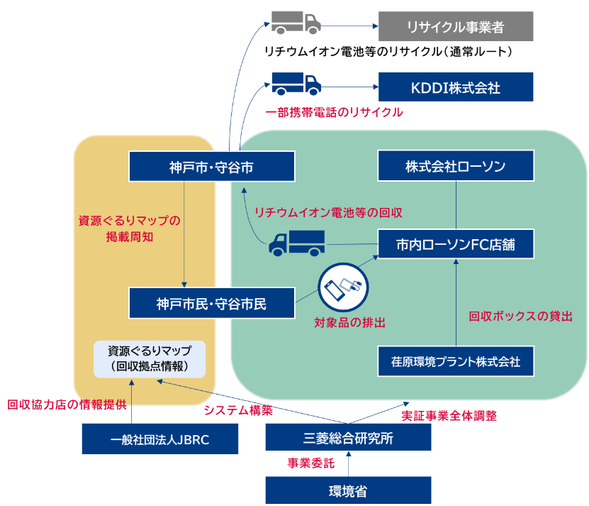 今回の実証事業では、守谷市と神戸市のローソン計4店舗に、リチウムイオン電池を内蔵した 対象製品の回収用ボックスを設置します。店舗で回収した製品は、それぞれの市が回収し、リサイクル工場へ搬入されます。守谷市では、KDDI社が守谷市から回収した携帯電話やスマートフォンを受け取り、これらのリサイクルを行います。また、リチウムイオン電池等の回収場所を地図上に示すウェブサイト「資源ぐるりマップ」に、ローソンの対象店舗も掲載することで回収の促進を図ります。