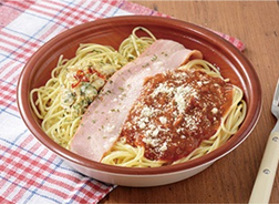 肉とトマトの旨みを引きたたせたミートソースパスタと、鶏もも肉、玉ねぎ入りのマカロニグラタンをセットにしました。 |