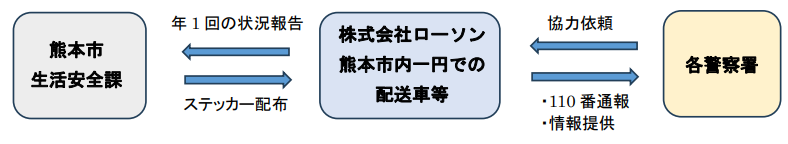 株式会社ローソン(本社:東京都品川区、代表取締役 社長:竹増 貞信、以下「ローソン」)は、熊本市の依頼に応じ11月10日(月)から犯罪抑止及び事件事故の早期解決を目的に、熊本市内を走行するドライブレコーダーを搭載したローソンの商品配送トラックや営業車に「地域見守りパトロール中」のステッカーを貼付して地域防犯活動を開始します。また、ドライブレコーダーの記録データを提供して事件事故の早期解決に繋げます。ローソンが、車両に「地域見守りパトロール中」のステッカーを貼付し、ドライブレコーダーの記録データを提供する地域防犯活動への協力は今回が初めてです。