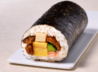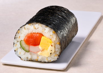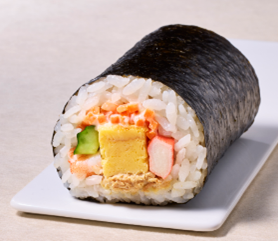 「カルローズ・ハッピー巻」(税込430円) 米の重量のうち約10%をカルローズ米としています。 サーモン、カニ風味かまぼこ、厚焼玉子、きゅうりに、胡椒で風味付けしたクリームチーズマヨネーズを合わせ洋風に仕立てた恵方巻です。 ※アプリ予約限定。1都3県(東京都、神奈川県、埼玉県、千葉県のみで販売) <商品サイズ:直径 約5.0cm、長さ 約9.0cm> |