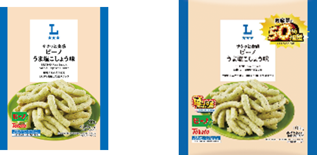 「ローソンオリジナル サクッと食感 ビーノ うま塩こしょう味 50%増量 105g」(税込138円) 従来品の「サクッと食感 ビーノ うま塩こしょう味 70g」と比較して、内容量を約50%増やしました。 生地にえんどう豆を100%使用した豆スナックです。 ※ナチュラルローソンでの販売はありません。 ※約29万食(供給可能数量) |