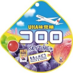 コロロ SKYTIME味(ももとぶどう) 40g 税込 160円 JAL機内食で人気の飲料「スカイタイム」と独特の食感が特長のグミ「UHA味覚糖 コロロ」のコラボレーション商品です。スカイタイムのももとぶどう味を、プチっと弾ける柔らかい食感が特長のコロロで再現しています。JALの飛行機をデザインしたパッケージに入れました。 |