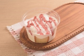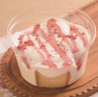 いちごのカップシフォンケーキ(宮城県気仙沼市産いちごのジャム)」:税込297円 宮城県産小麦の小麦粉を使用した生地に、ホイップクリームと宮城県気仙沼市産のいちごを使用したいちごのジャムを盛り付け、いちごチップを散らしました。※いちごチップは宮城県気仙沼市産ではありません。 |