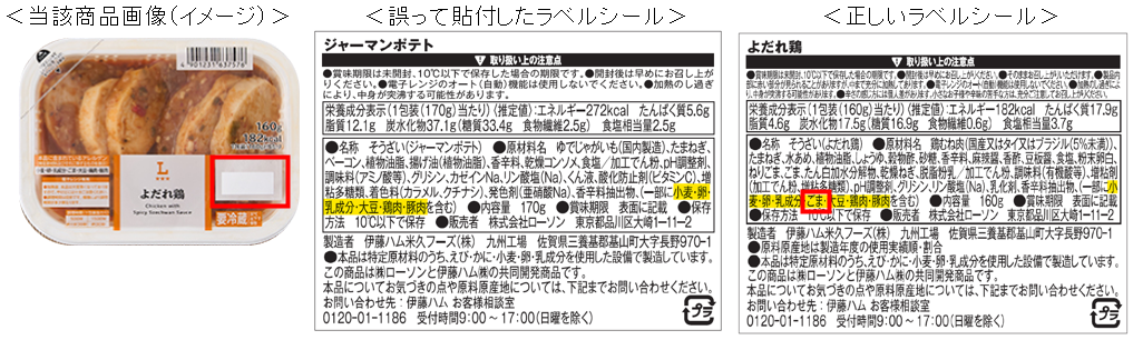 この度、全国のローソン・ナチュラルローソン店舗(九州地区と沖縄県を除く)にて、2025年10月6日(月)正午~10月14日(火)午後6時の間に販売いたしました、お惣菜「よだれ鶏」の一部商品において、誤って「ジャーマンポテト」の商品情報が印字されたラベルシールを裏面に貼付している可能性があることが判明しました。