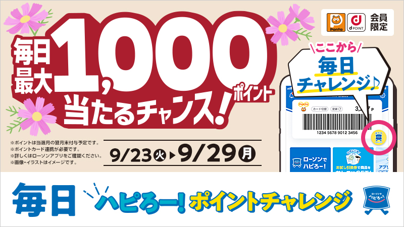 9月23日(火)~9月29日(月)の期間中に最大1,000ポイントもらえるチャンスです!ぜひ、毎日チャレンジしてください!