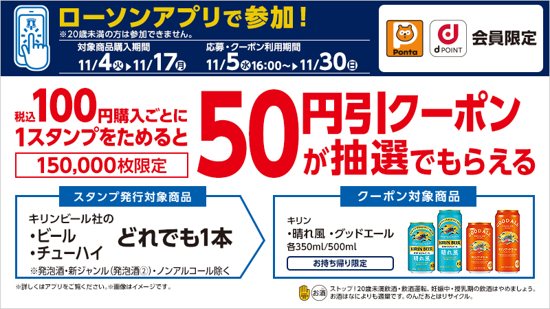 ・対象商品購入期間中、ローソンで会員カード(Pontaカード/dポイントカード)をご提示の上、対象商品を合計100円(税込)購入ごとに、翌日午後にスタンプがたまります。