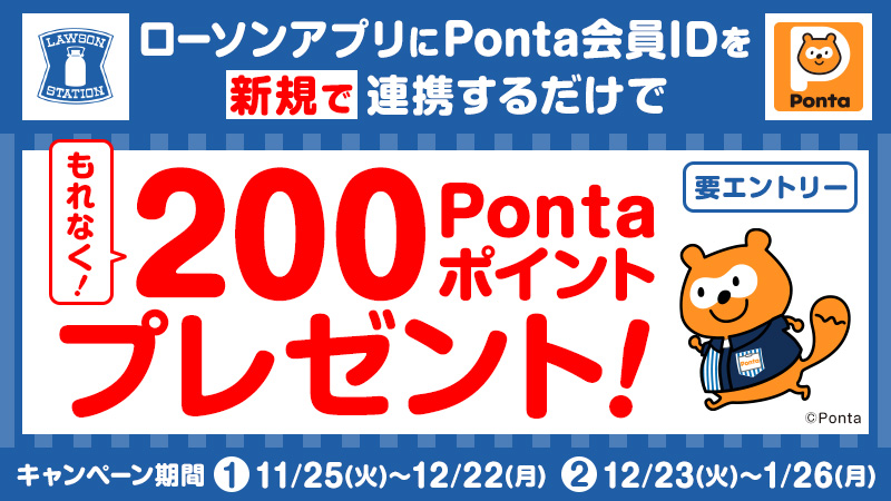 キャンペーン期間中に本ページよりエントリーの上、ローソンアプリではじめてPonta会員ID連携した方に、もれなく200Pontaポイントをプレゼントいたします。