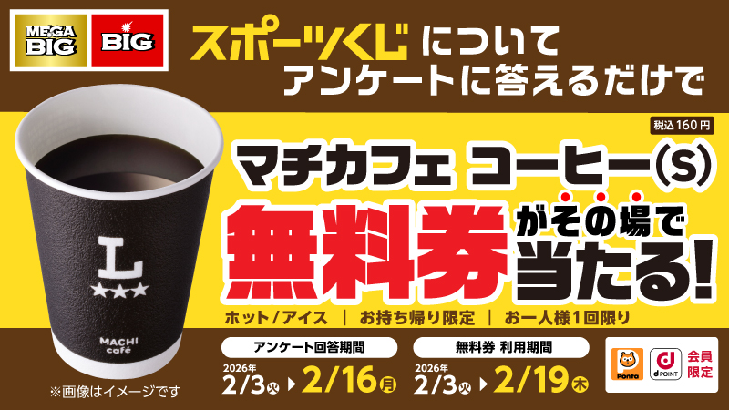 【ローソンアプリ スポーツくじアンケートキャンペーン】マチカフェ コーヒー(S) ホット/アイスの無料券がその場で当たる!