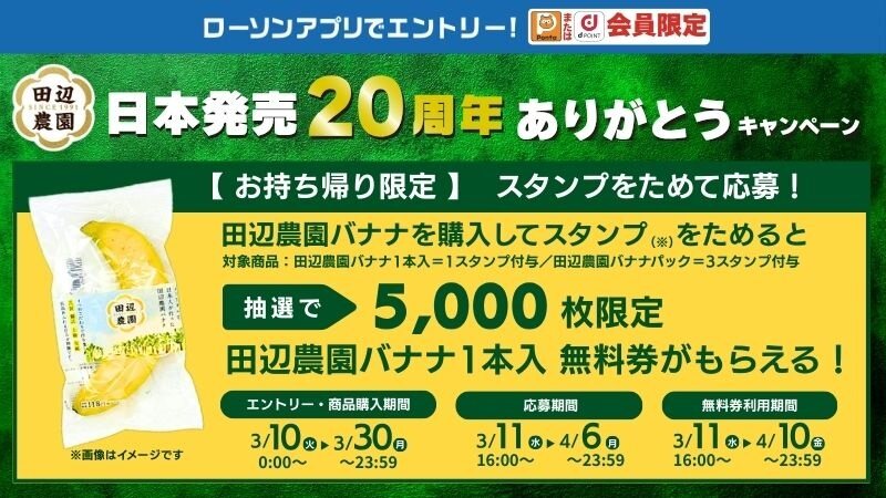 【ローソンアプリ限定】3/10(火)から、田辺農園バナナ日本発売20周年ありがとうキャンペーン