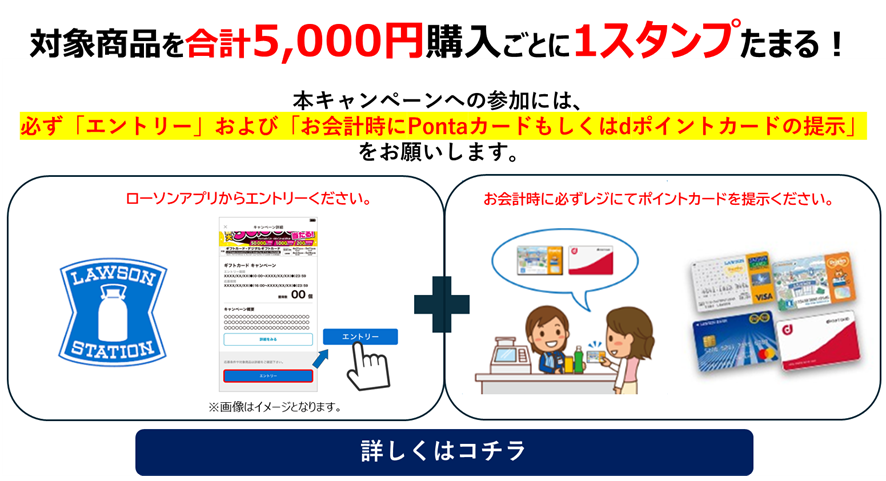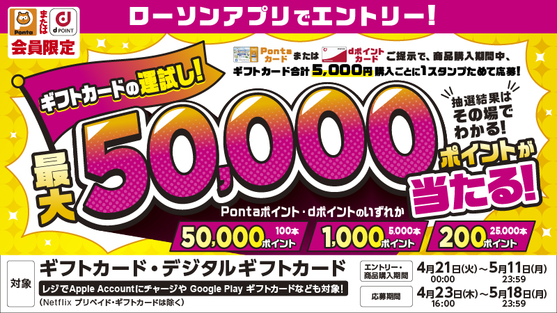 対象の期間中、ローソンアプリでエントリーの上、会員カード(Pontaカード/dポイントカード)を提示して、対象のギフトカード・デジタルギフトカード(※Netflix プリペイド・ギフトカード、プレイステーション®ストアカード10,000円・15,000円は除く)を合計5,000円購入ごとに1スタンプがたまります。