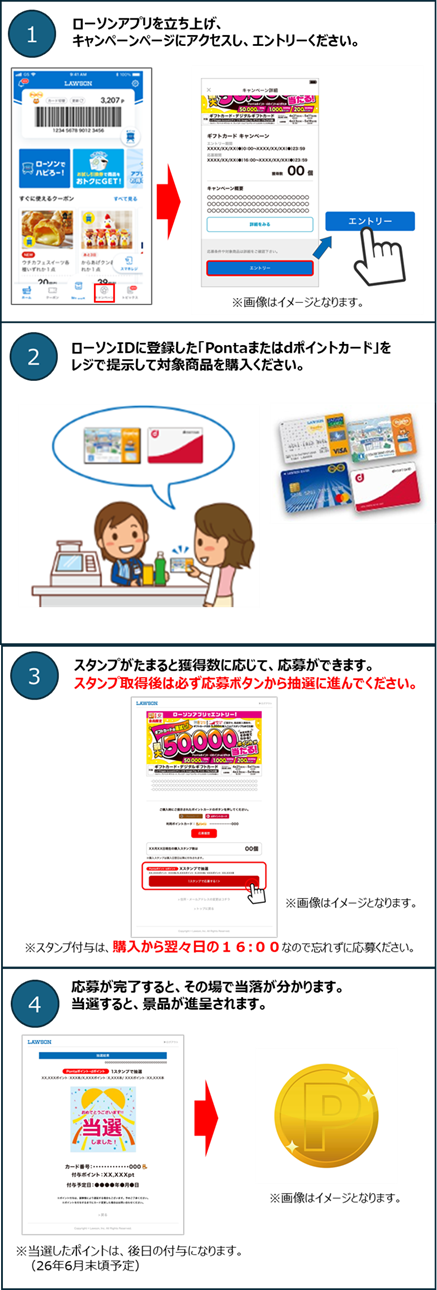 1)対象商品購入期間中に、ローソンIDに登録した会員カード(Pontaカード/dポイントカード)を提示の上、対象商品を購入してください。