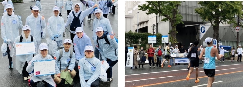 当日は、ローソン(ローソン・スリーエフ、ローソン高知含む)、ローソンストア100、ローソンエンタテインメント、ローソン・ユナイテッドシネマ、ローソン銀行、成城石井、ベストプラクティス、SCI、ローソンデジタルイノベーション、株式会社スリーエフの社員及び家族で、フルマラソン39.0km地点にて「LAWSON給水所」として約2.5万人のランナーの皆さんを一丸となってサポートしました。今回は、天候が心配される中での活動でしたが、後半は雨もあがり、精一杯の応援ができました。