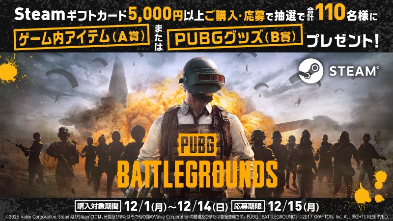 キャンペーン期間中「Steamギフトカード」をご購入・ご応募で、人気バトルロイヤルゲーム『PUBG: BATTLEGROUNDS』のゲーム内アイテム、またはPUBGグッズを抽選で110名様にプレゼント!