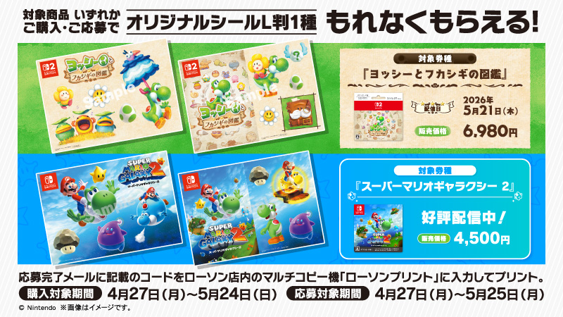 キャンペーン期間中『ヨッシーとフカシギの図鑑』または『スーパーマリオギャラクシー 2』ダウンロードカードをご購入・ご応募で、もれなくオリジナルシール(L判)1種をプリントできるコードをプレゼント!