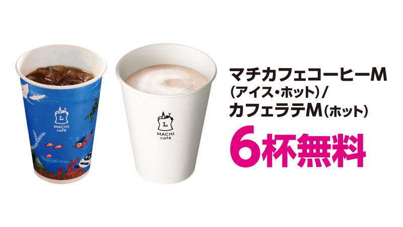 ・無料回数券:マチカフェコーヒーM(アイス・ホット)/カフェラテM(ホット) 6杯無料