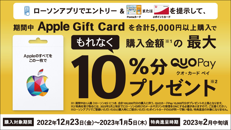 ローソンアプリでエントリーをし、2022年12月23日(金)~2023年1月5日(木)の間にPontaカードまたはdポイントカードを掲示して期間中に Apple Gift Card を合計5,000円以上購入すると、もれなく購入金額の最大10%分の QUOカードPay をプレゼント!