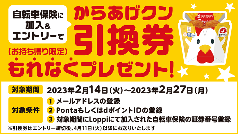 ②対象期間中(2023年2月14日(火)から2月27日(月))にローソンLoppiにて自転車保険に加入し、店頭にて保険料のお支払いが完了している方