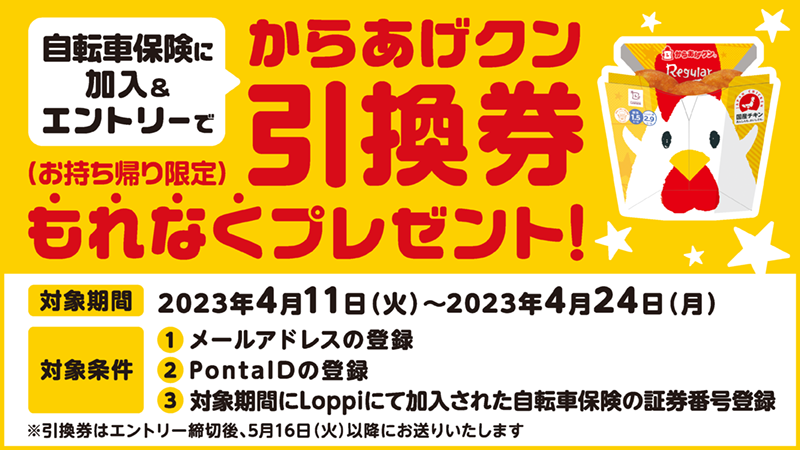 ②対象期間中(2023年4月11日(火)から4月24日(月))にローソンLoppiにて自転車保険に加入し、店頭にて保険料のお支払いが完了している方