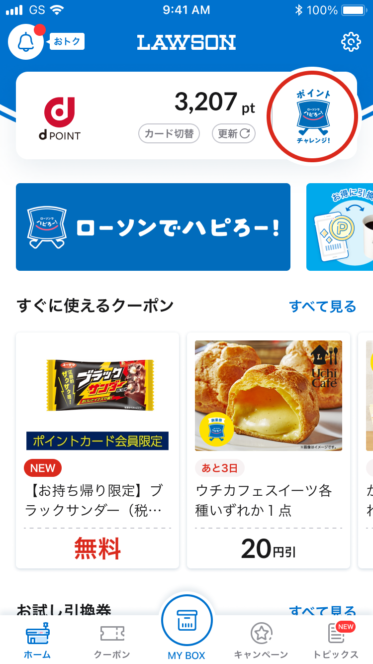 ローソンアプリのホーム画面から、ポイントチャレンジ。