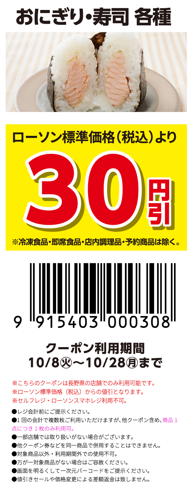 【長野県限定】おにぎり・寿司 各種 30円引クーポン