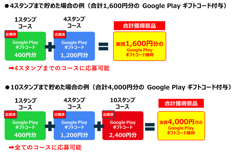 ※累計10スタンプで、全コース同時応募すると最大4,000円分の Google Play ギフトコードプレゼント。