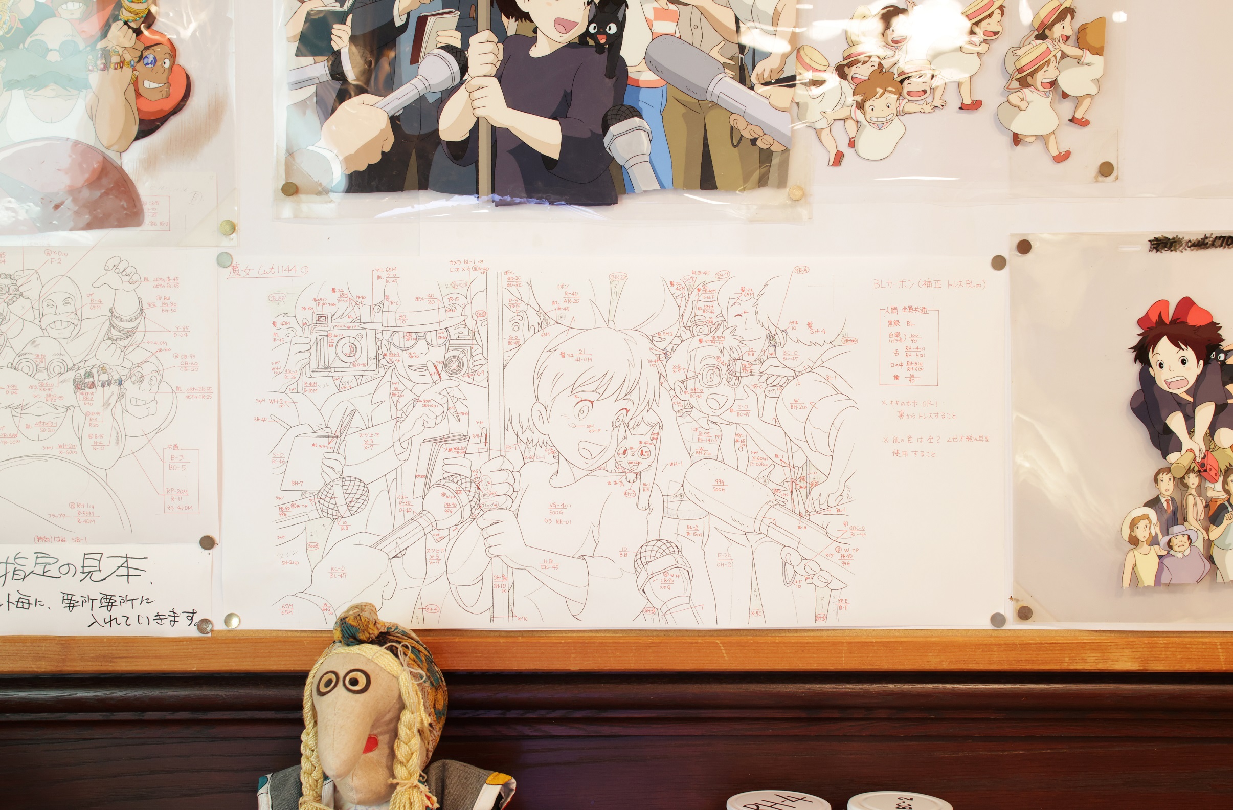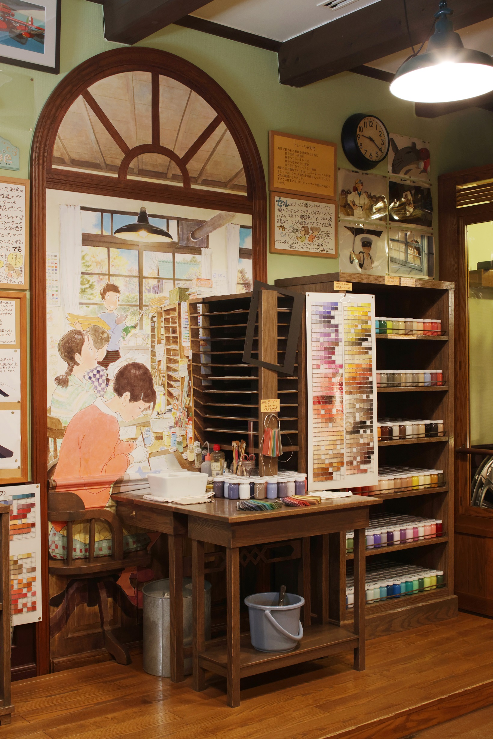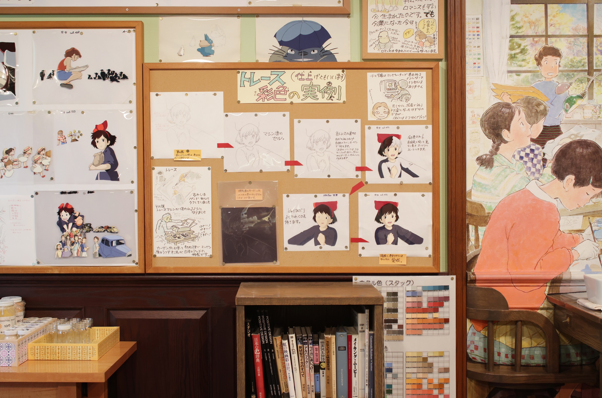 前工程にて描かれた動画は透明なセル板にうつされ、彩色される。まさに、キャラクターたちに命が吹き込まれる瞬間といえよう。常設展示室では、この「仕上げ」の仕事場の様子も表現されている。現代ではデジタル化され、コンピューターで色を指定して彩色を行っているが、当時は一枚一枚、絵の具を調合して色をつくって塗る作業を行っていた。また壁画には、仕上げ作業が主に女性中心の仕事だった頃のアニメーションスタジオの様子が描かれている。そんな当時の彩色工程の雰囲気を楽しんでほしい。