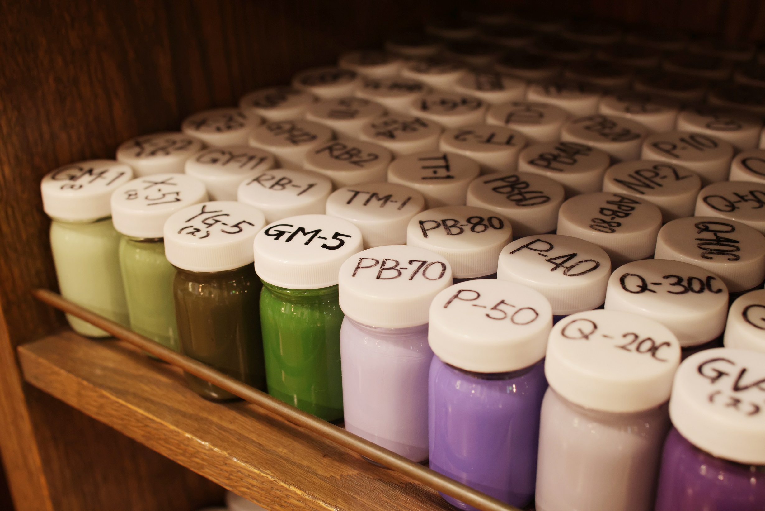 ▲色指定とは、セルに塗る色の指示のこと。1作品に600~700の色が使用されており、細かく色番号が指定される。色番号は現代のようにRGB数値で指定されるのではなく、プロダクションによって各々が勝手に命名したもの。調合具合によって色は変わるため、同じ色を2度つくるのは簡単ではなく、事前にそれぞれの色がどれくらい使われるかを想定して用意されていた。