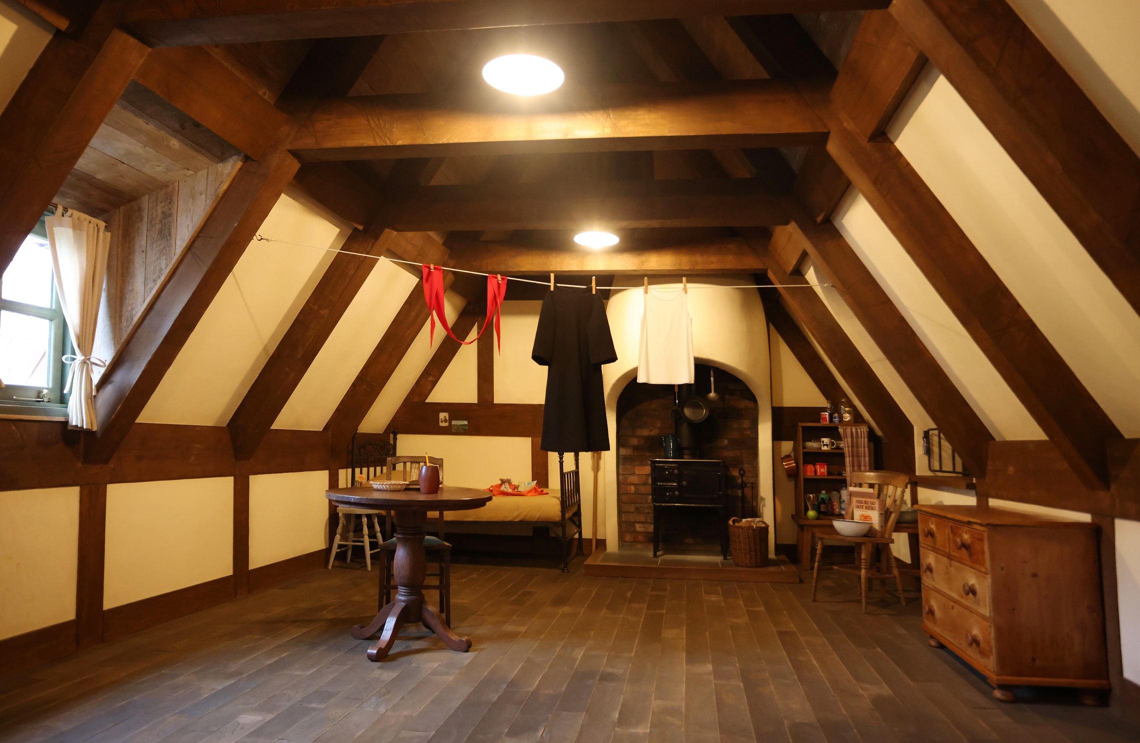 ▲部屋の中にはベッドやキッチンストーブなどまさに作品の中にはいり込んだような光景が。雨の日は室内にキキのワンピースが干されていることも。