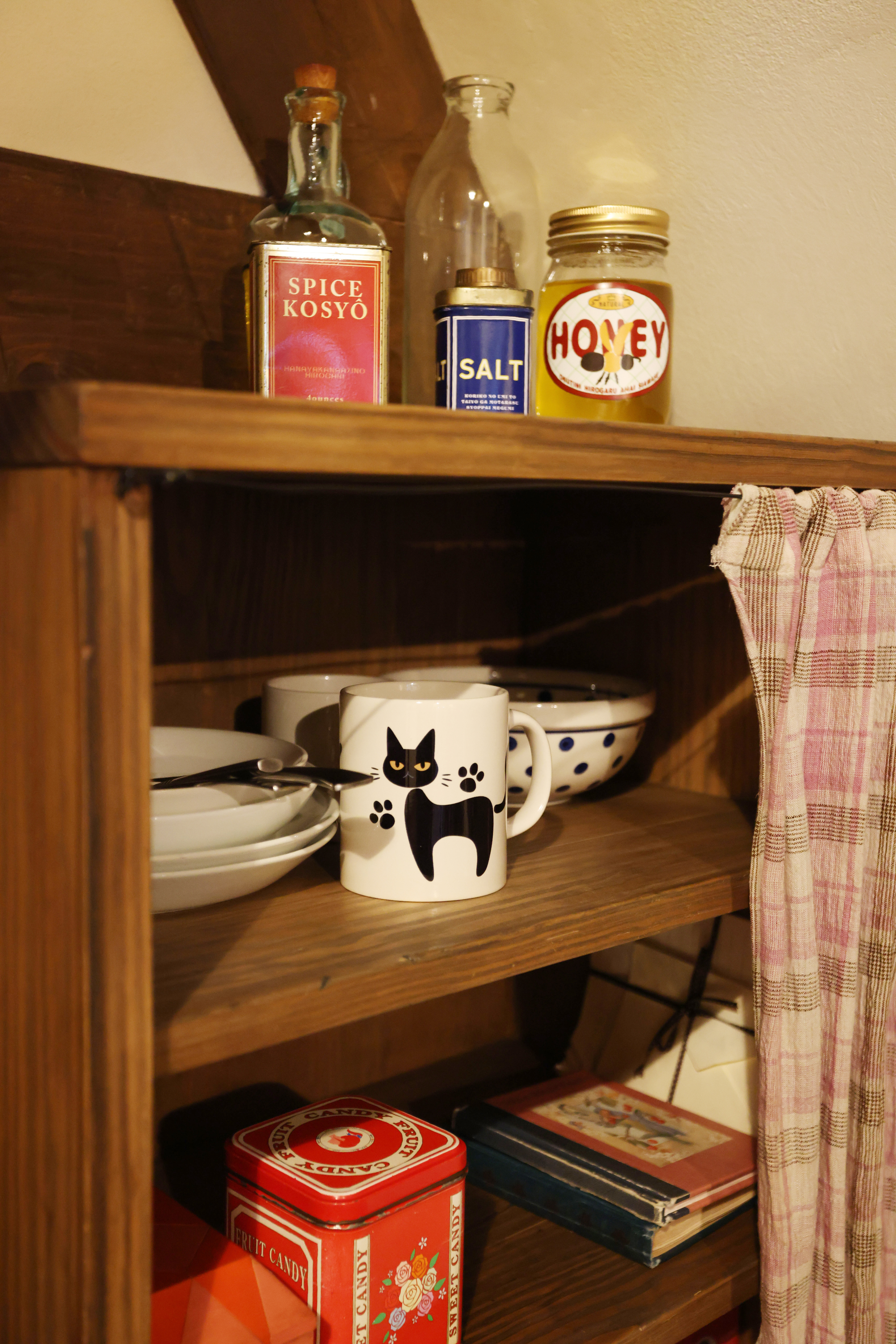 ▲棚から覗くのは“あの”マグカップ…?隣のキッチンストーブで日々料理をしているのだろう。