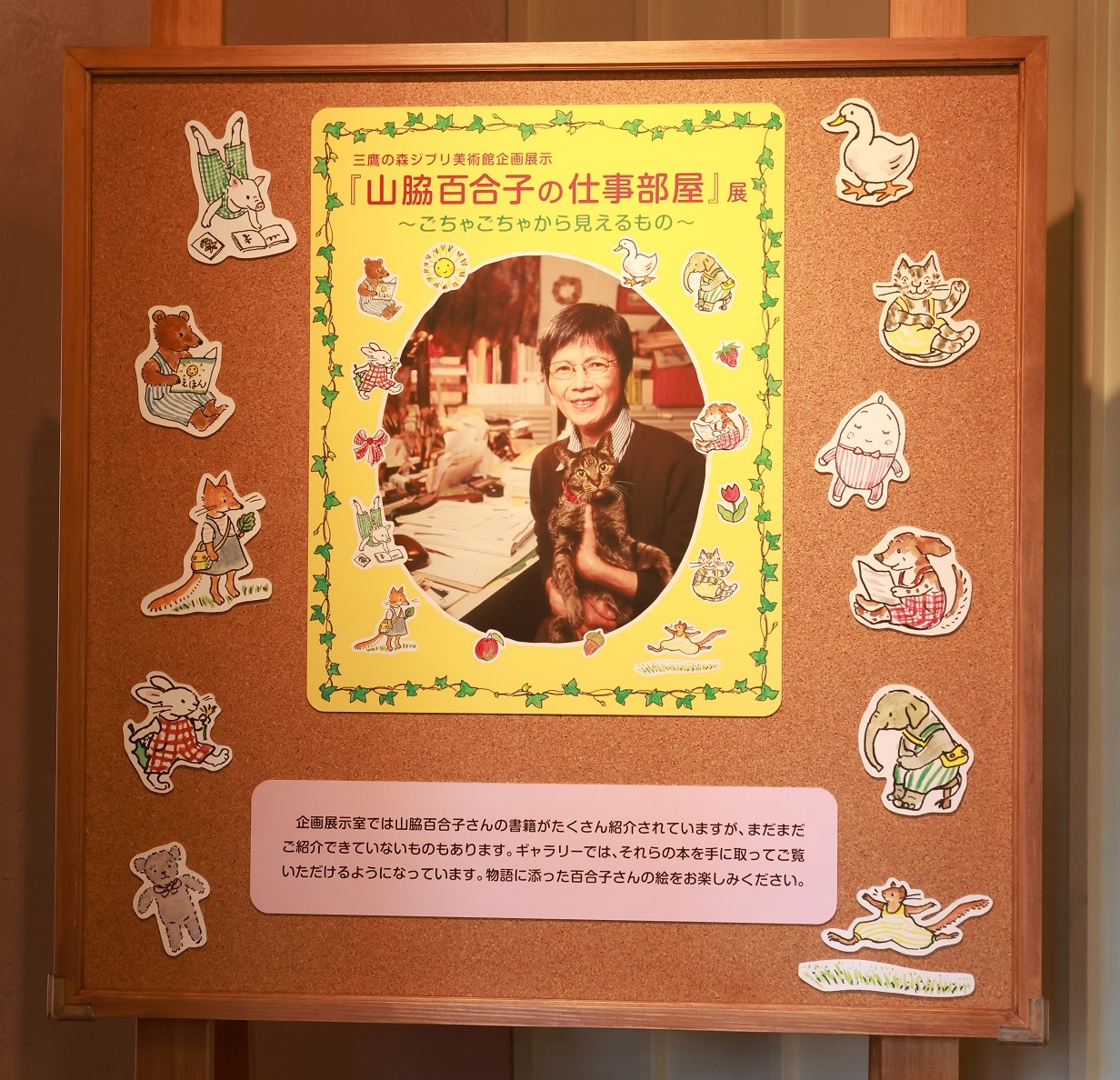 企画展示室で開催中の「『山脇百合子の仕事部屋』展~ごちゃごちゃから見えるもの~」。そこでは数えきれないほどの山脇さんの作品や“仕事”を紹介しているが、2階南側のギャラリーでも多くの本が展示されている。山脇さんが手がけた「そらいろのたね」に出てくるお家をイメージした本棚に飾られている絵本は、どれも手に取って良し。木の切り株に座って、ゆっくり楽しんでみよう。