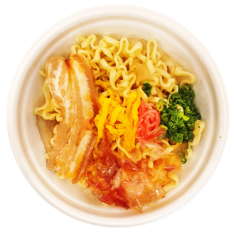 レンジで温めてすぐ食べることが出来る沖縄そばです。麺はコシの強いちぢれ麺を使用。スープはかつおダシを感じるスープに変更し、さらにかつお節をトッピングすることで蓋を開けたときに、かつおの香りが漂ってきます。三枚肉と錦糸卵、ねぎ、紅生姜をトッピングしました。