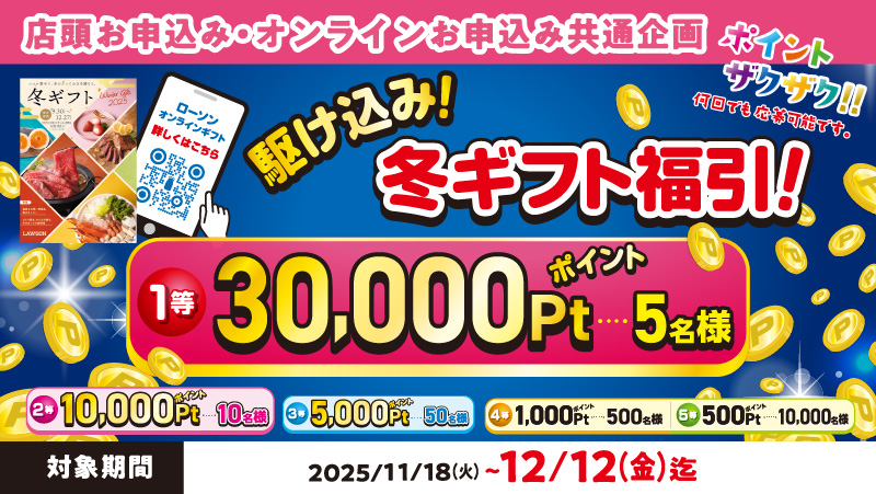 ローソン店頭、または「ローソンオンラインギフト」サイトでギフトをお申込みいただいた方の中から抽選で最大30,000ポイントが当たるキャンペーンを実施します!