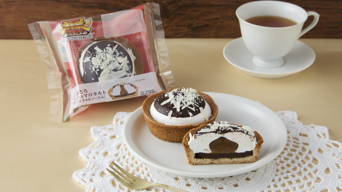 チョココーティングしたマシュマロをタルトにしたふわパリ食感スイーツ。