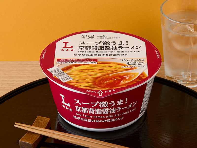 濃厚な背脂や鶏ガラの旨みと醤油のコクが利いた、深みのある京都らしい醤油スープが特長のカップ麺です。