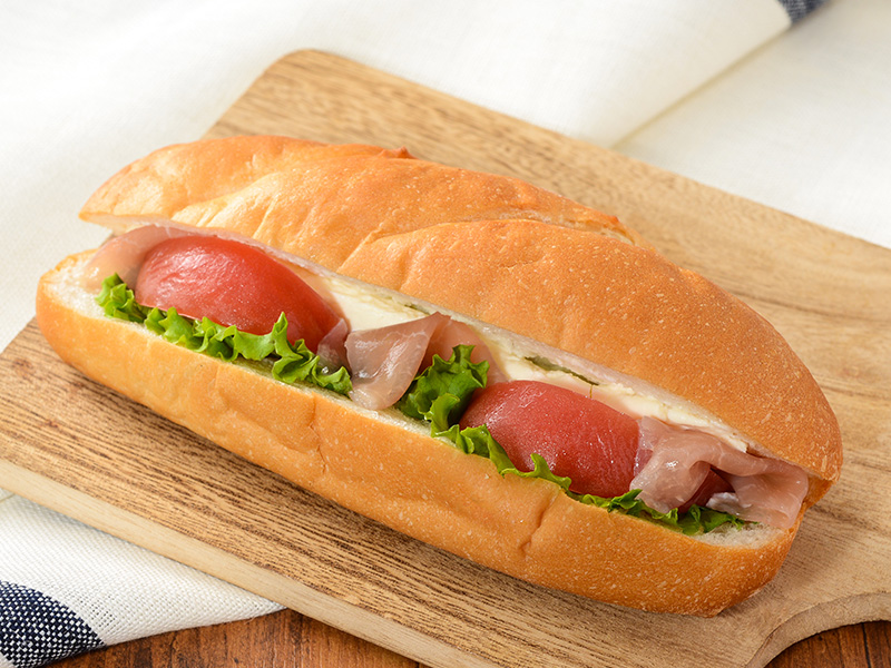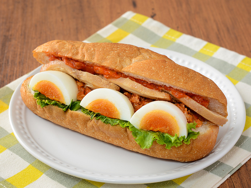 食べやすいソフトフランスパンに、ローストチキンやたまご・グリーンリーフをはさんで、トマト入りチリミートソースを合わせました。