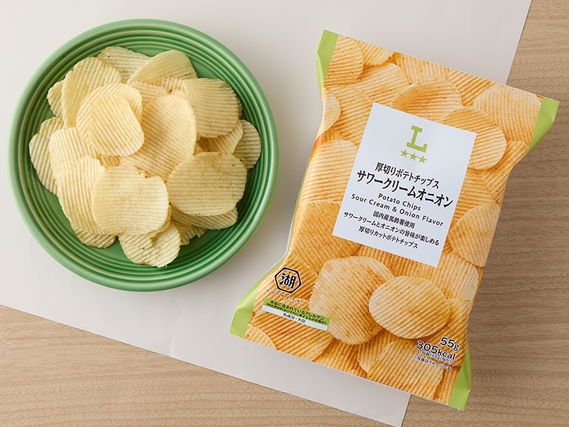 国内産馬鈴薯を使用し、サワークリームとオニオンの旨味が楽しめる厚切りカットポテトチップスです。