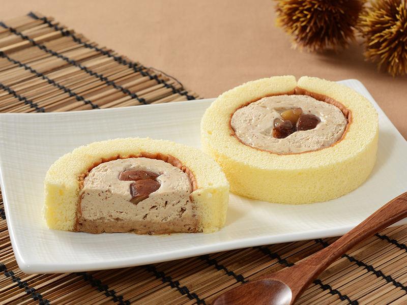 ふんわりスポンジに渋皮栗を使用した2層のマロンクリーム、マロンダイスで仕上げた栗づくしのロールケーキです。