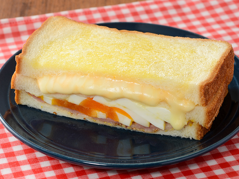 ベーコンとたまごをはさんだチーズが とろけるホットサンドです。