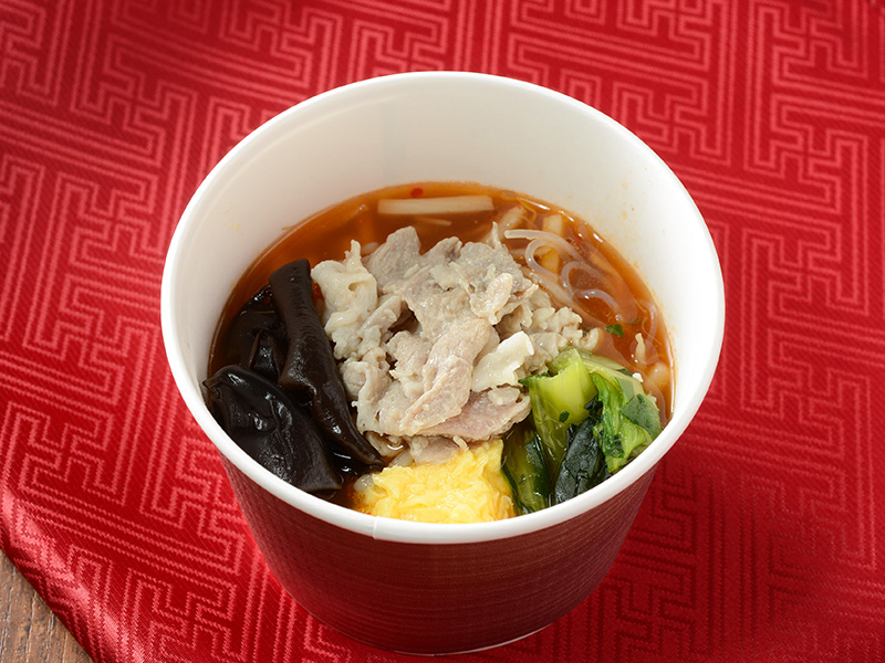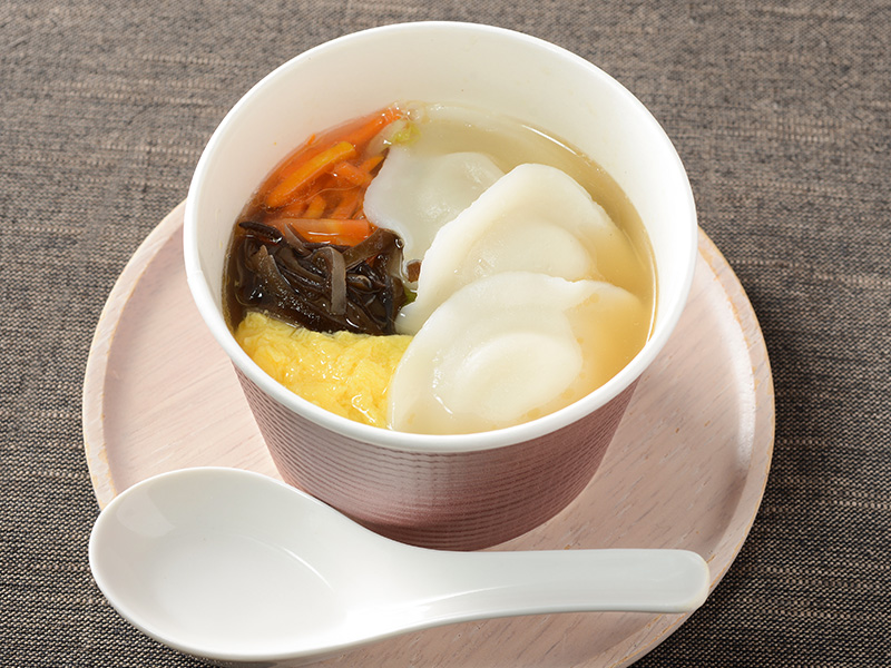 モチモチ餃子と彩り良い食材のスープに、春雨も入って食べ応えの良い商品です。