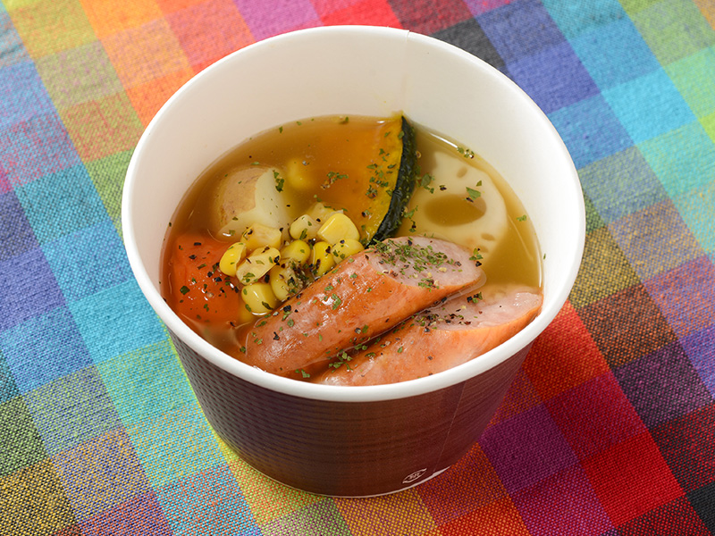 キャベツ、玉ねぎ、じゃがいも、人参、かぼちゃ、コーン、蓮根、ウインナーの8種の具材が入った食べ応えのあるポトフです。