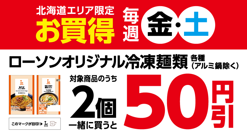 【北海道エリア】毎週金土限定! ローソンオリジナル冷凍麺類2個一緒に買うと50円引!